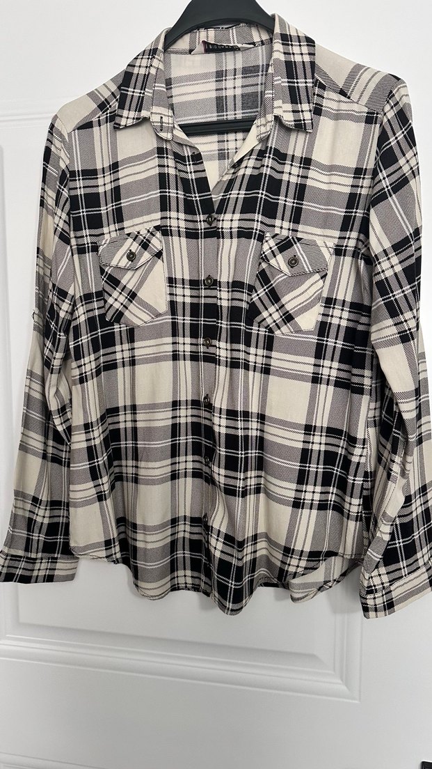 Gri ve bej ekose desenli, düğmeli, uzun kollu, yakalı pamuk gömlek. Rahat kesim ve midi boyda, günlük sokak stiline uygun. 44 beden yazıyor ama m giyene olur