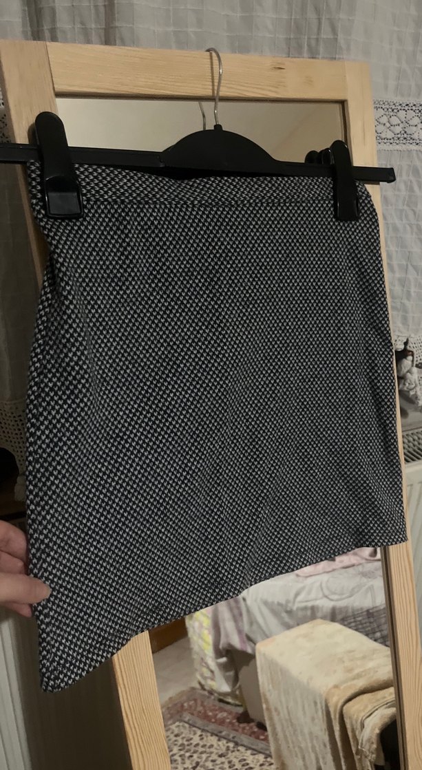 Düğmeli, ekose desenli gri mini etek, günlük kullanıma uygun trend sokak stili sunar.