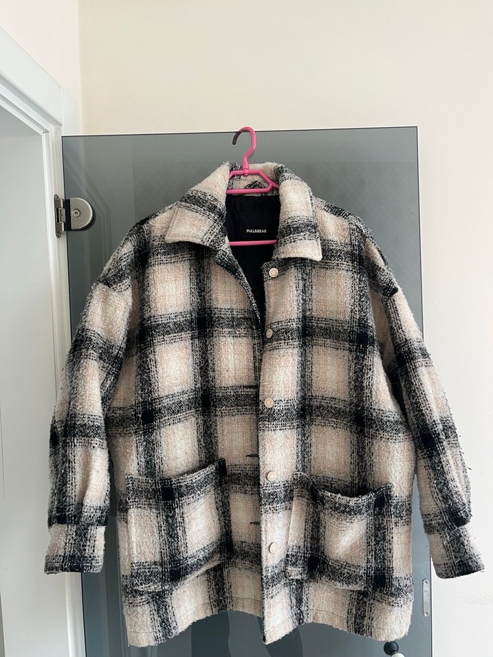 Yumuşak yünden, düğmeli, ekose desenli, bol kesim, uzun kollu ve notched lapel yakalı gri kadın kaban.