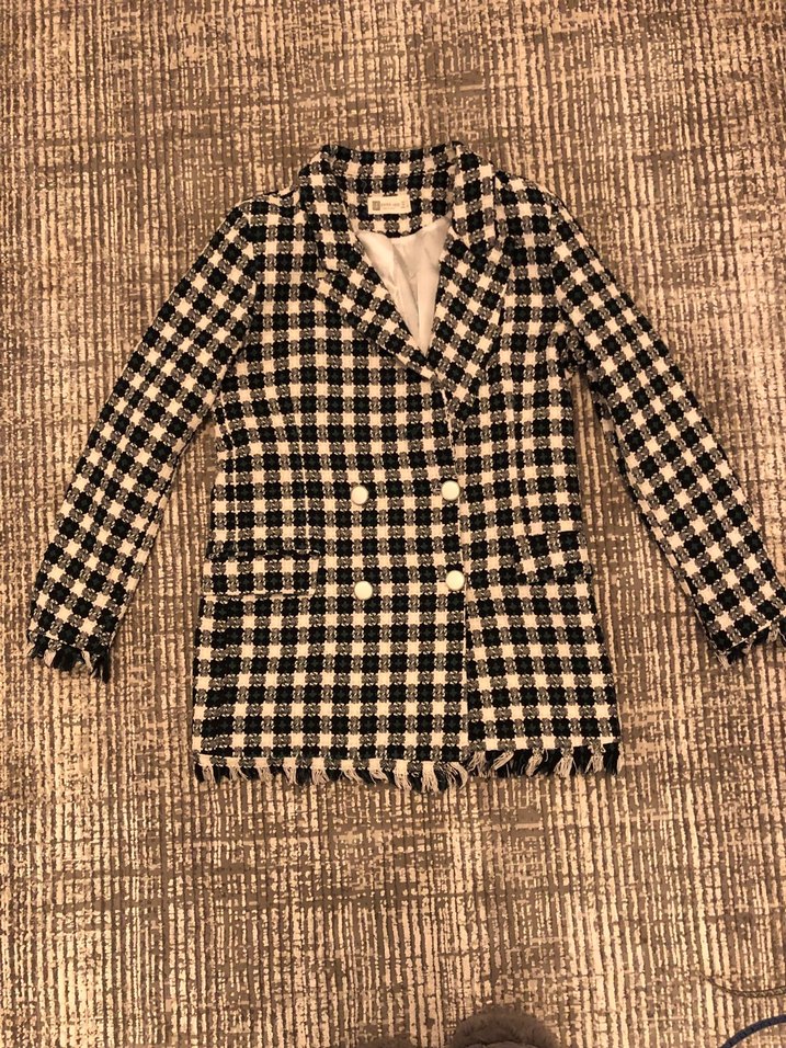 ekose desenli kadın blazer, düğmeli ve kesik yakalıdır. Uzun kollu, normal midi boy ve yün kumaştan, trend sokak stili için uygundur.