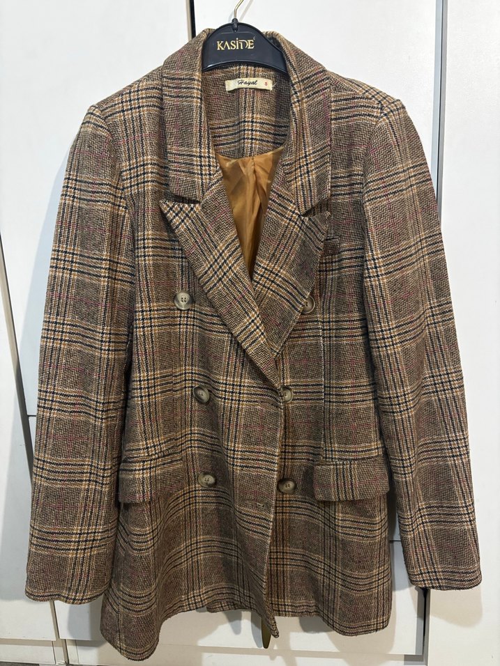 Kahverengi ekose desenli kadın blazer ceket, düğmeli ve uzun kolludur. Yün kumaştan olup, normal kesim ve ofis kullanımı için uygundur.