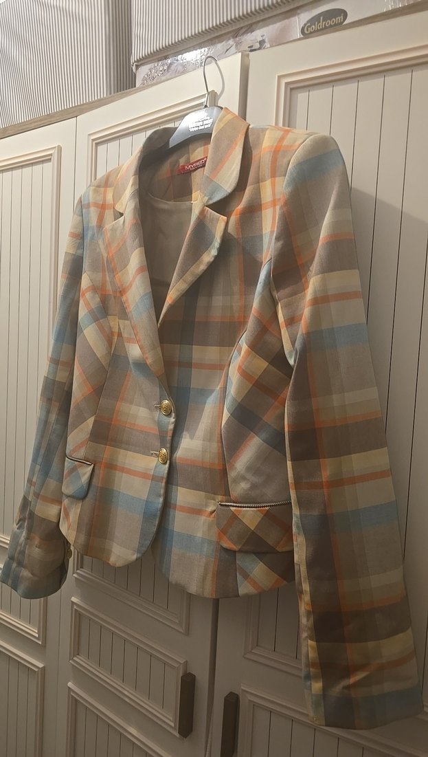 Düğmeli, uzun kollu, normal boyda kadın blazer. Ekose desenli, bej ve kahve tonlarında, iş ortamına uygun şık bir ceket.