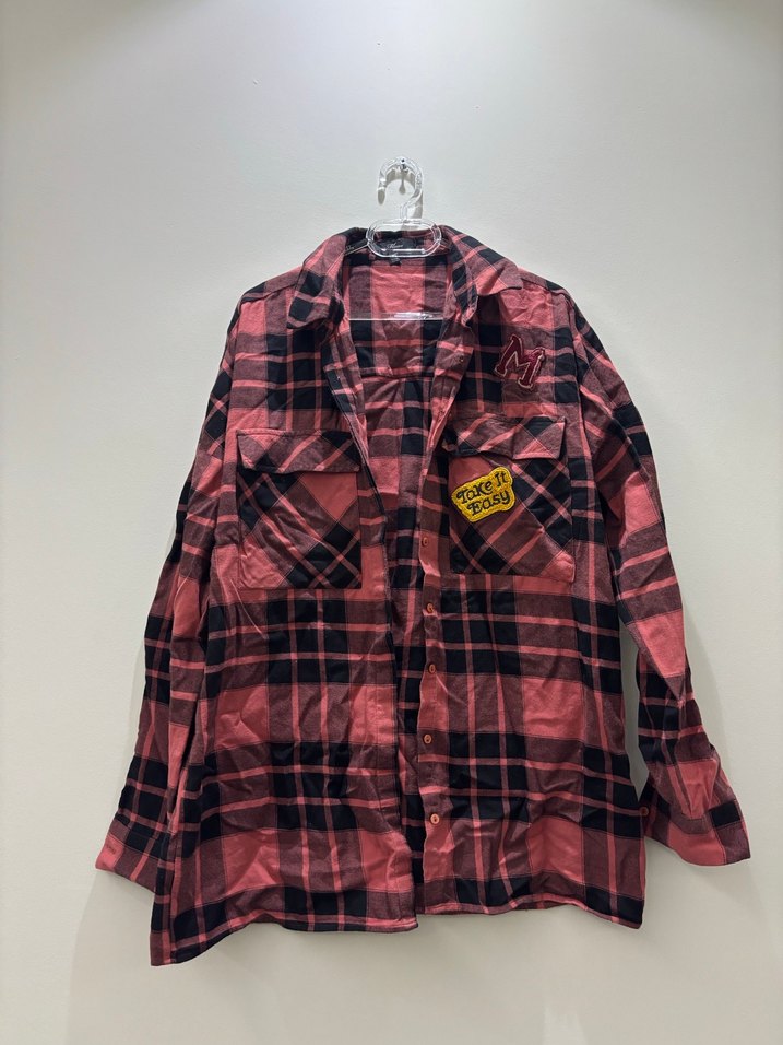 Düğmeli, uzun kollu ve notched yakalı koyu ekose desenli kadın gömlek. Salaş kesimi ve midi boyuyla grunge punk tarzını yansıtır.
