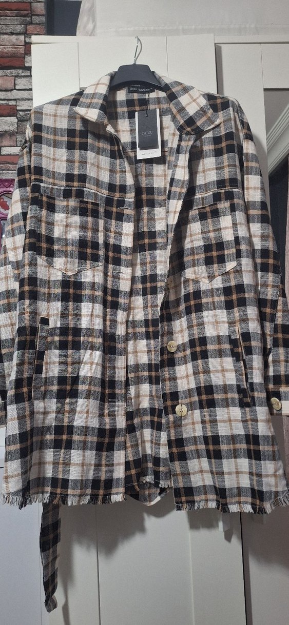 Düğmeli, uzun kollu, uzun elbsie boy ekose desenli kahverengi tonlarında kadın gömlek. Bol kesim ve notlu yaka detaylı, günlük kullanıma uygun. Kemer detayına sahiptir. 0 hiç kullanılmamıştır. Etiketli üründür. Eur 36 Usa S bedendir.