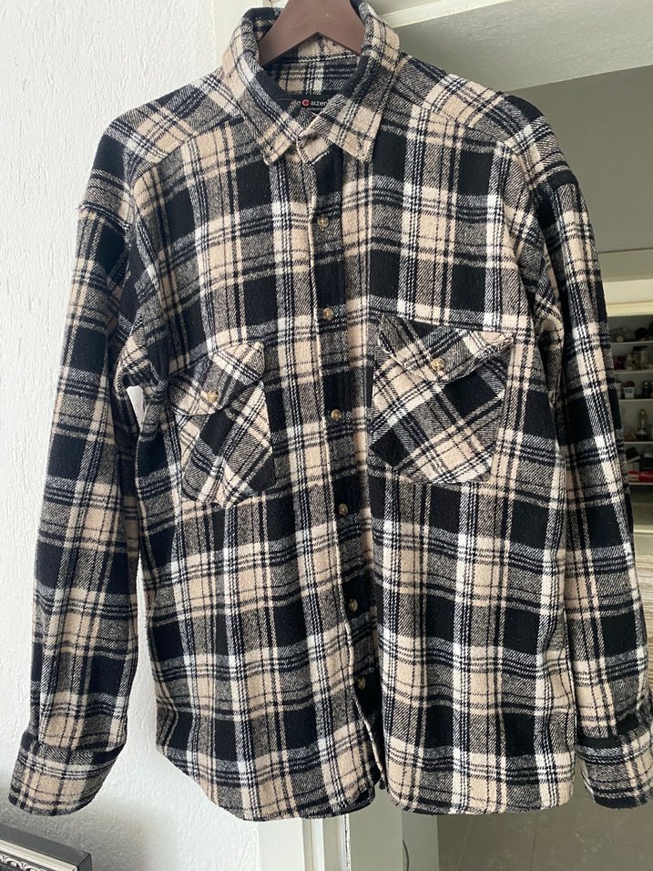 Düğmeli, uzun kollu, rahat kesim kadın gömleği. Bej ve gri ekose desenli, yumuşak yün kumaştan, günlük kullanım için uygun.