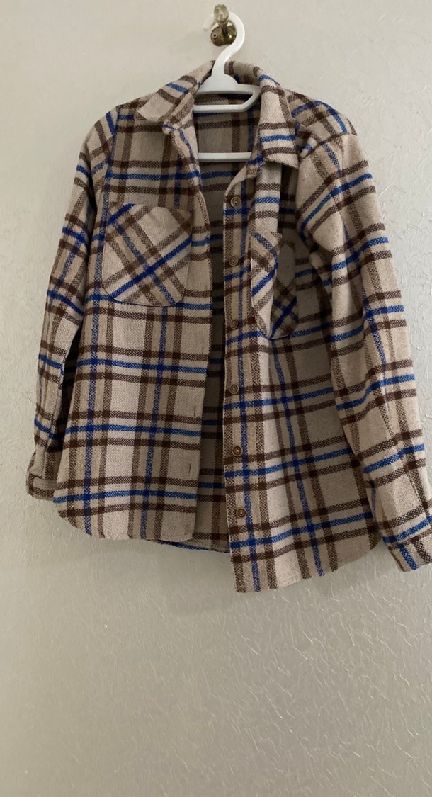 Düğmeli, uzun kollu, yumuşak yün kumaştan kahverengi ve gri ekose desenli, salaş kesim kadın gömlek. Rahat ve sokak modasına uygun günlük kullanım için ideal.