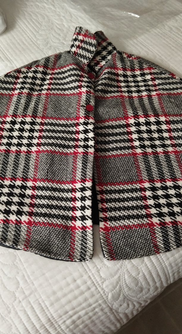 Düğmeli ön kısmı ve kesik yaka detaylı panço. Gri ekose desenli, askılı kollu, midi boyda ve rahat kesimdir.