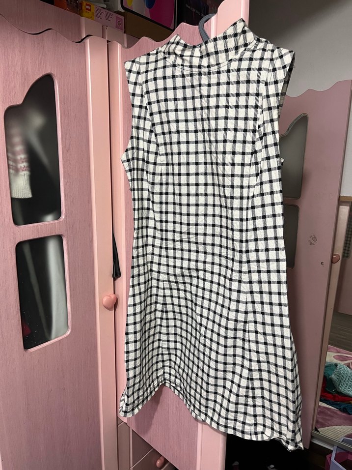 Düğmeli, yüksek yakalı, ekose desenli kolsuz mini elbise. Pastel beyaz renkte, sentetik kumaştan, rahat sokak stiline uygun.