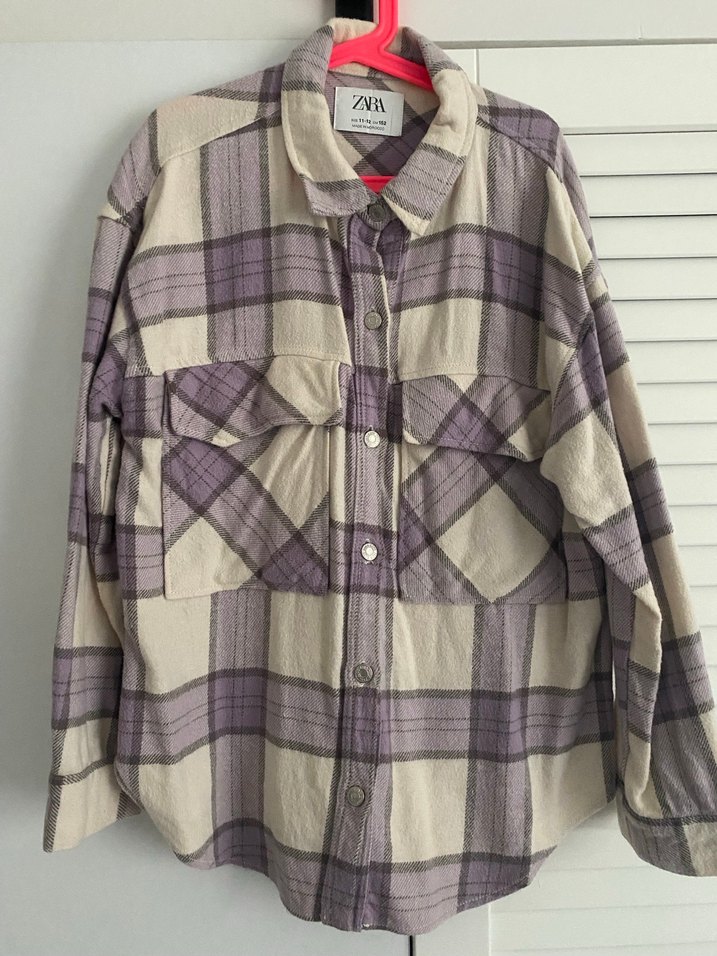 Düğmeli ön cep detaylı, uzun kollu, bol kesim kadın gömleği. Bej ve mor ekose deseniyle, yumuşak dokulu kumaştan üretilmiştir.