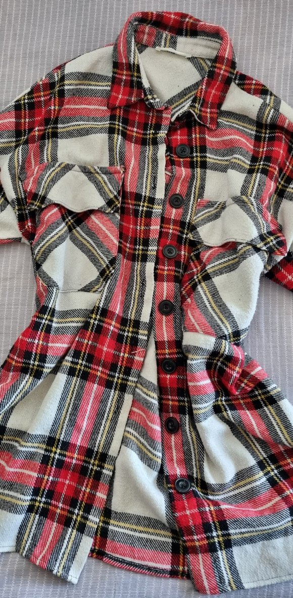 Yumuşak pamuklu kumaştan, düğmeli, çok renkli ekose desenli, uzun kollu, notched lapel yakalı, bol kesim midi uzunluğunda kadın gömleği.