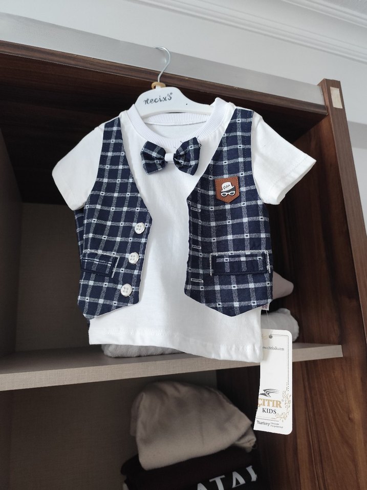 Pamuklu kumaştan yapılmış, düğmeli ekose desenli yelek ve papyon detaylı, beyaz kısa kollu bebek erkek takımı.