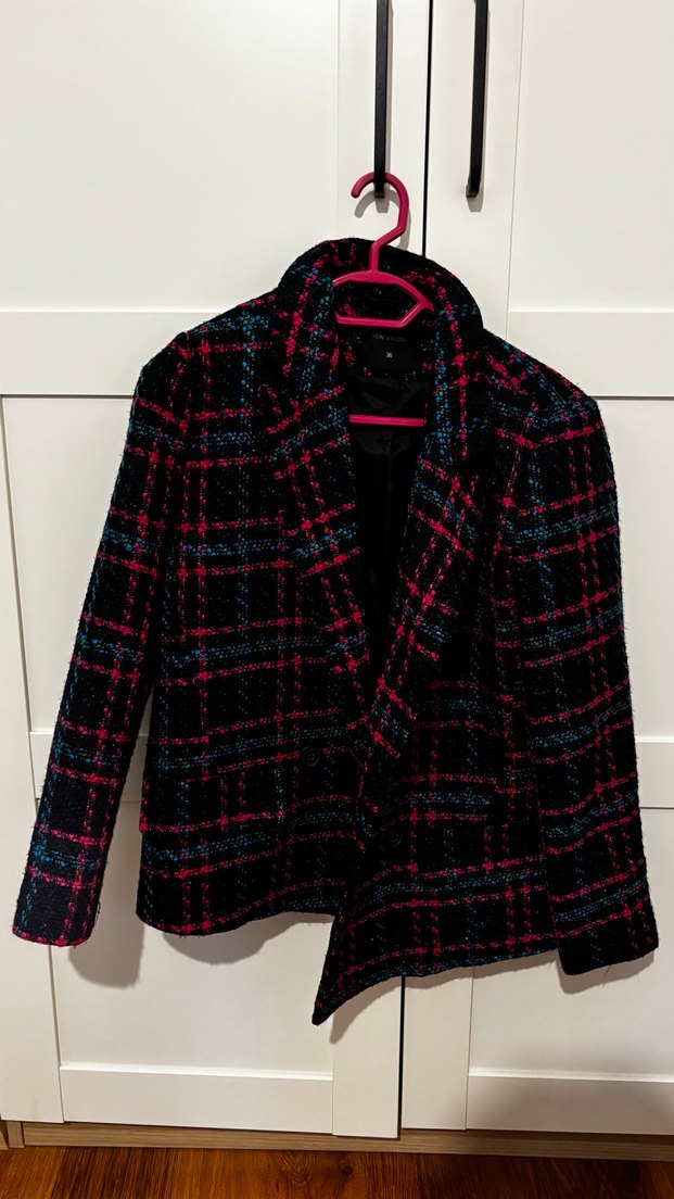 Kadınlar için düğmeli, yün kumaştan yapılmış ekoseli Blazer . Normal uzunlukta, uzun kollu ve notched yaka ile günlük kullanıma uygun midi boyda, Paris tarzı street wear tarzında.