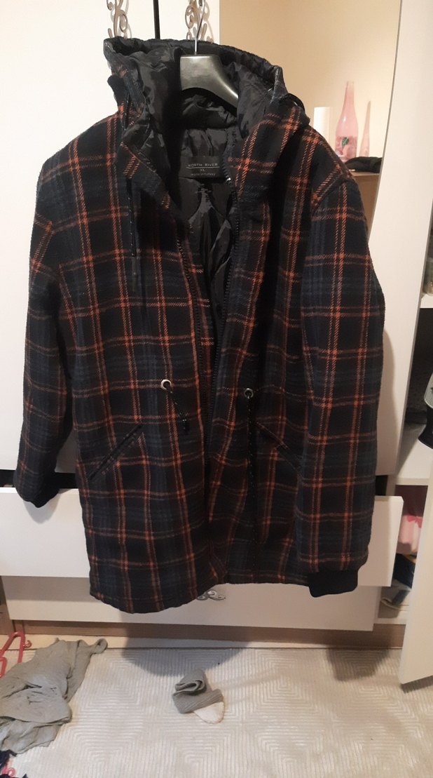 Kahverengi yün kumaştan, düğmeli, ekoseli, uzun kollu, notched yaka ve bol kesim kadın midi kaban. boy 85 iki kol arası 56 santim çok sıcak tutan bir ürün