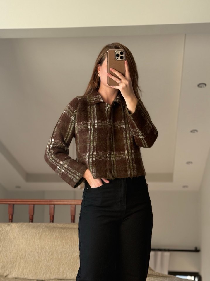 Kahverengi yün ceket, ekoseli desene ve düğmeli kapamaya sahip. Salaş kesim, uzun kollu ve yakalıdır. Günlük sokak stili için uygun. Bedenleri mevcuttur