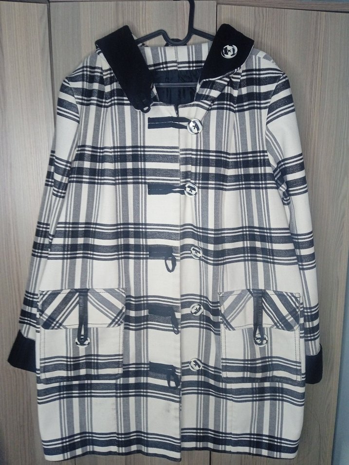 Düğmeli, çıtçıtlı, uzun kollu, ekoseli, gri ve beyaz renklerde, rahat kesim midi uzunluğunda kadın kabanı. Sokak stili için uygundur.