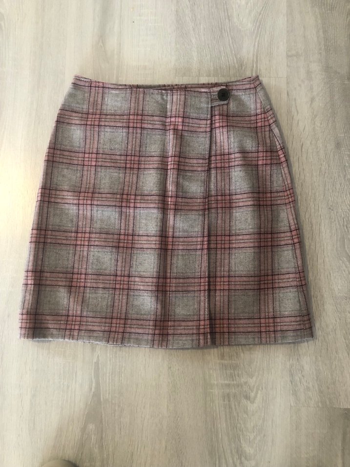 Düğmeli bej mini etek, rahat kesim, ekoseli desenli ve yumuşak kumaştan üretilmiştir. Günlük sokak stili için uygundur.