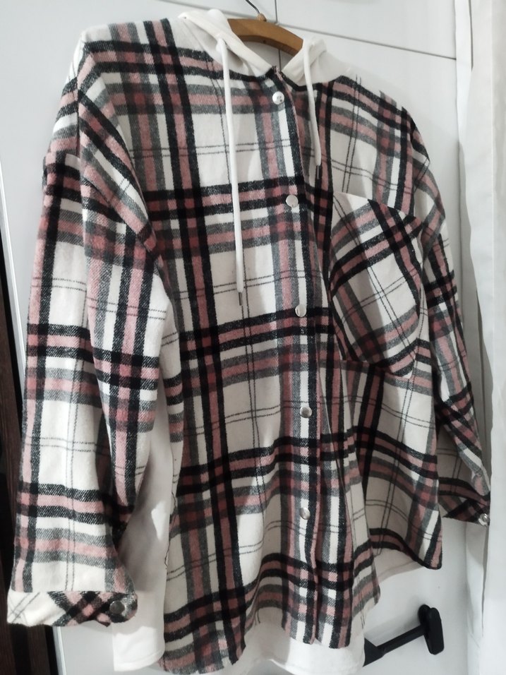 Gri beyaz ekoseli, düğmeli, uzun kollu, rahat kesim gömlek. Yuvarlak yakalı, midi boyda, sokak stiline uygun.