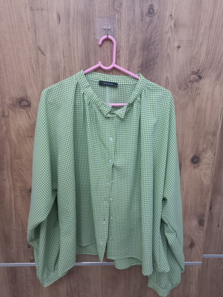 Düğmeli, uzun kollu yeşil keten gömlek, yakası kesik ve bol kesimdir. Pastel rengiyle gündelik kullanıma uygundur. trendyol milla, xl,xxl uygun