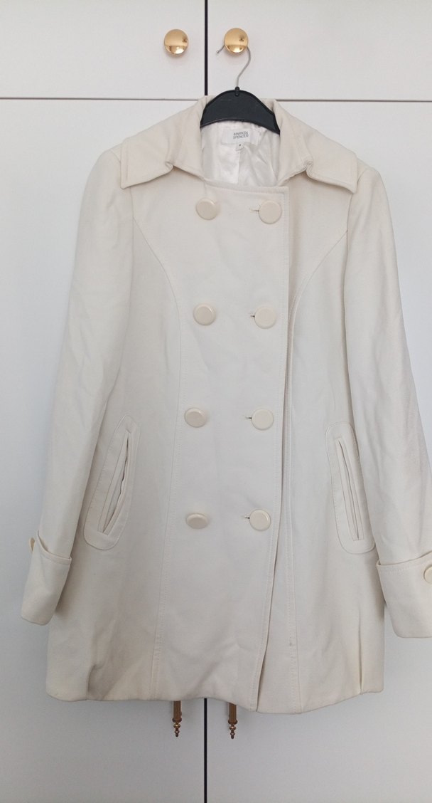 Kadınlar için çift sıra düğmeli, büyük düğmeli ve yan cepli ekru renk kaban. Klasik yaka ve pürüzsüz, açık renk kumaştan üretilmiştir.iki koltuk arası 50 cm.omuzdan aşağı 80 cm