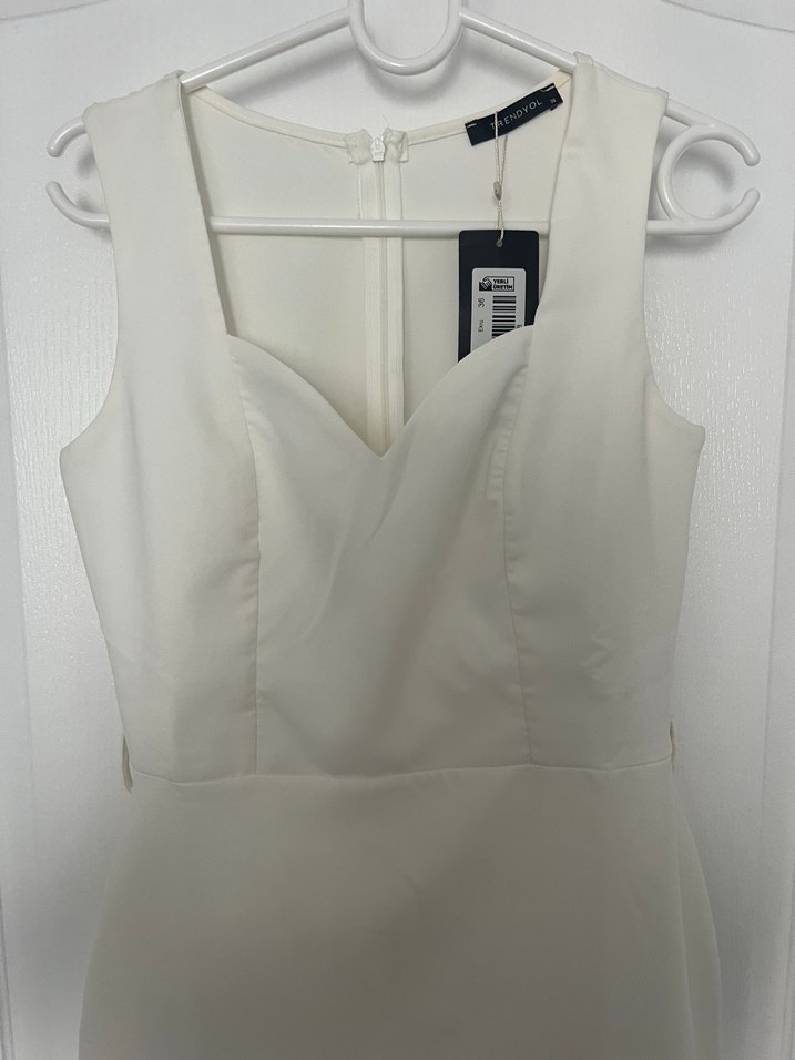 Düğmeli, V yakalı ve kolsuz, modern klasik kesim ekru renk abiye elbise, özel günler için uygun midi boyda. Boy 120 kol altı 43 cm