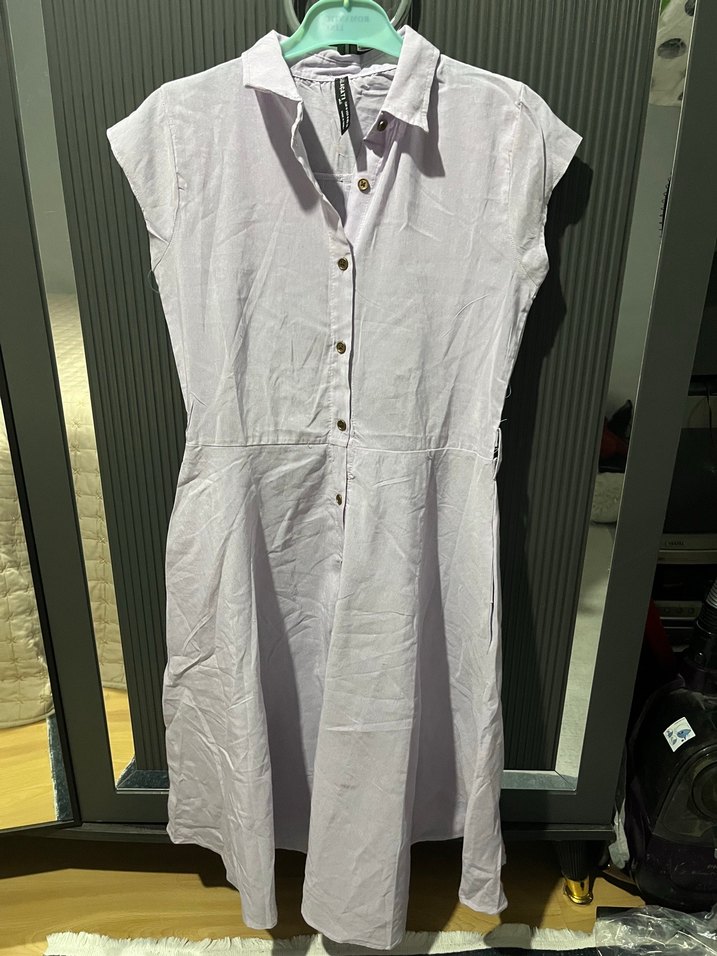 Yumuşak keten kumaştan, düğmeli ön ve yakalı kolsuz midi elbise. Günlük kullanıma uygun, sade ve düz renk tasarıma sahiptir.