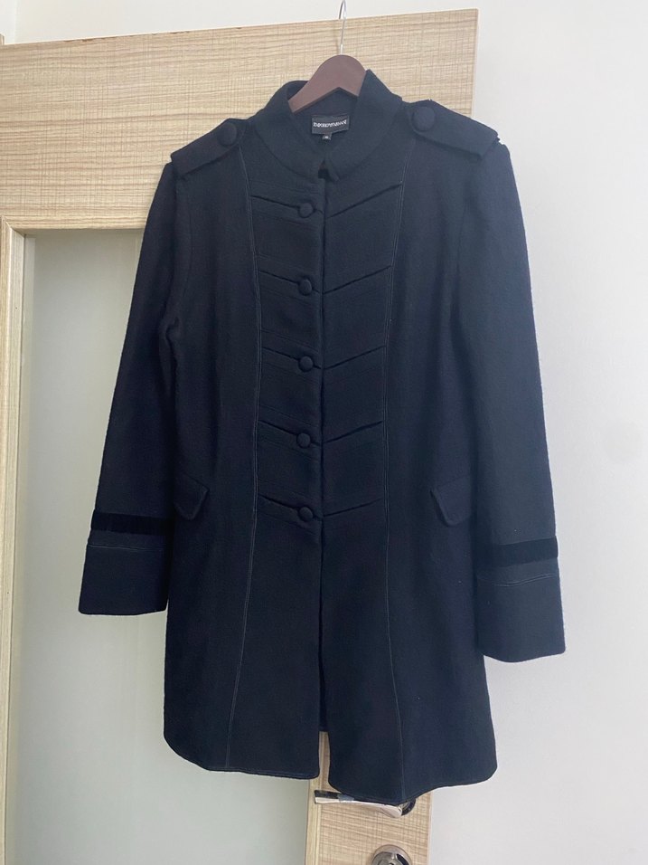 Düğmeli ön kısmı ve omuz detaylarıyla siyah kadın kaban, şık ve klasik bir tasarıma sahiptir. Çok temiz, yeni gibidir.