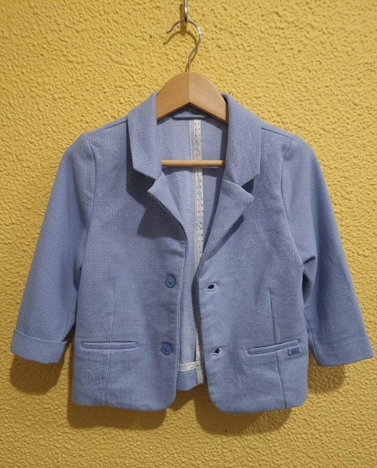 Düğmeli, kesik yakalı erkek çocuk ceketi, rahat kesim ve yumuşak, sıcak kumaştan yapılmıştır. Pastel mavi renkte, sade ve trend bir görünüme sahiptir. 1 Defa giyilmistor 6 aylik bebekler için