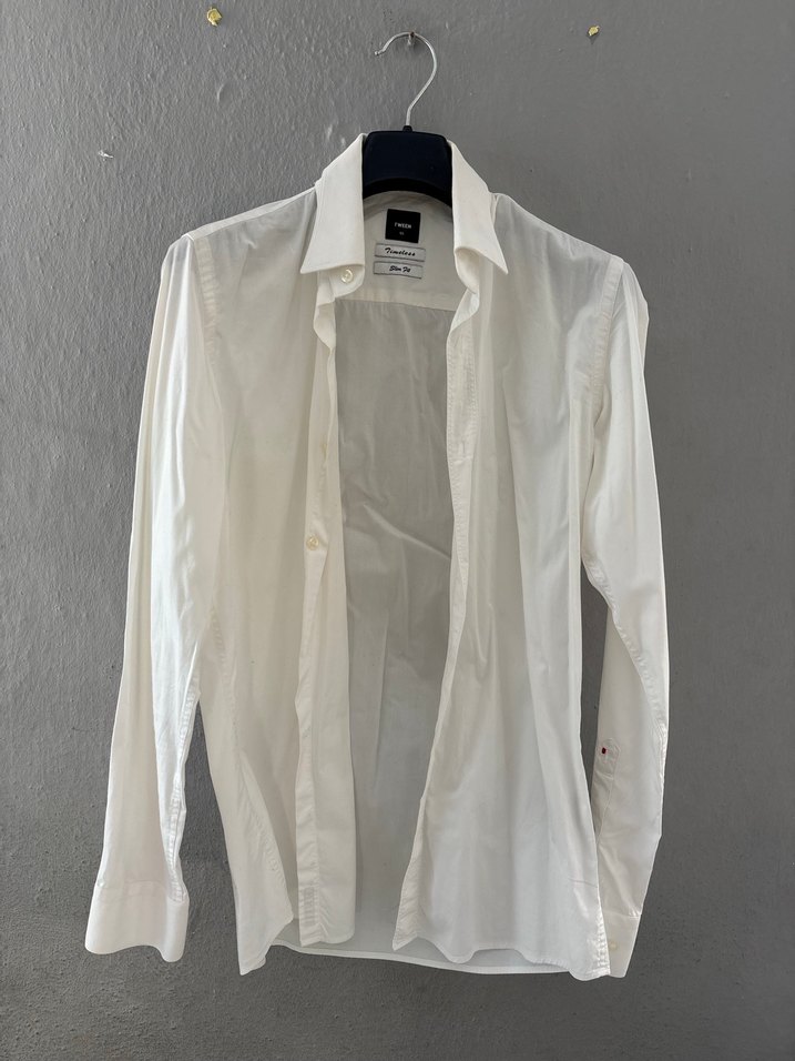 Düğmeli, beyaz erkek gömleği, klasik yakalı ve uzun kolludur. Ofis ve günlük sokak tarzına uygundur. ☁️