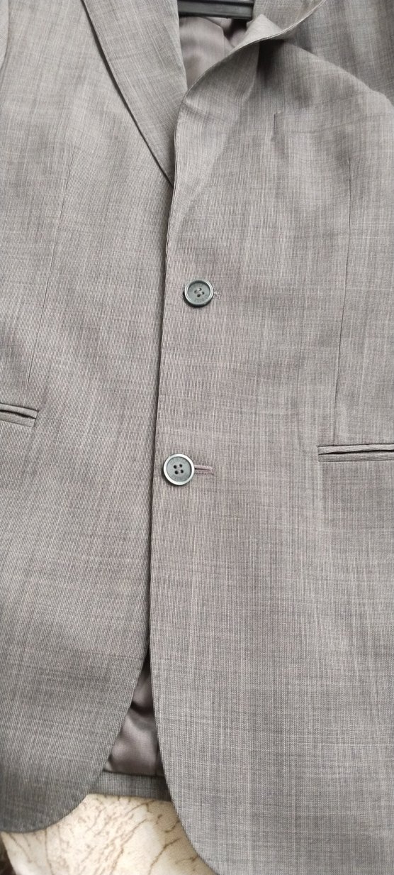Düğmeli, gri krem kircilli renkli erkek ceketi, normal kesim ve yaka detayına sahiptir. ofis ortamına uygundur. 44 drop6 bedene uygun
