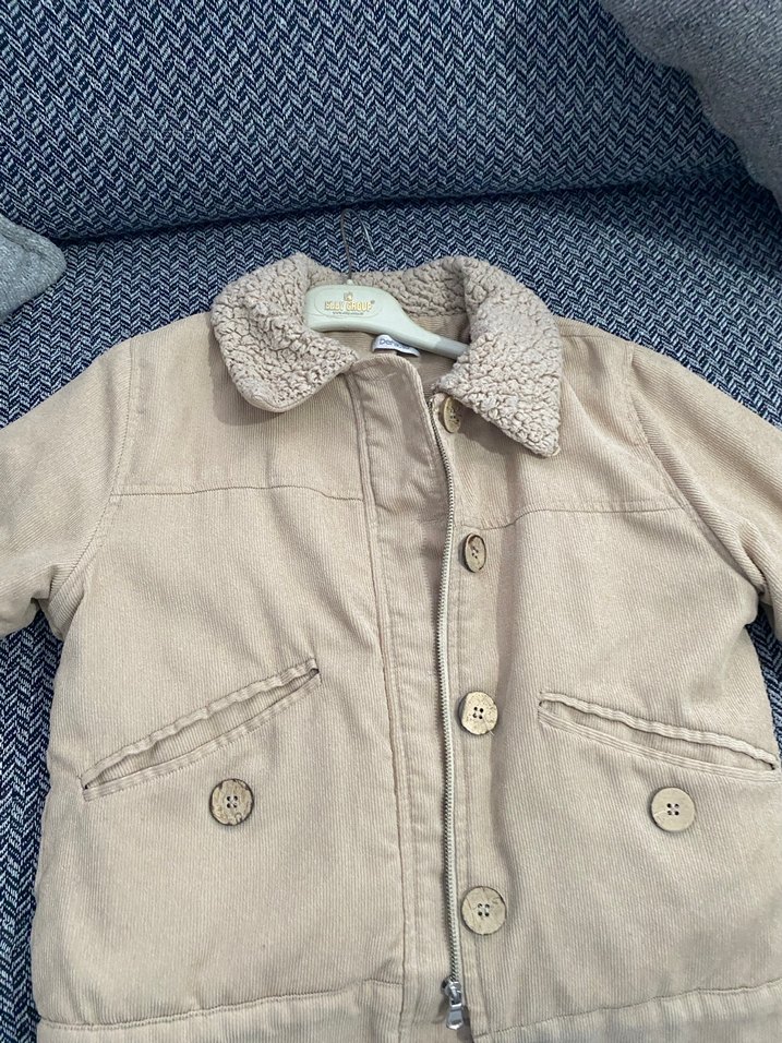 Düğmeli ve kırçıllı gri iç astarlı, pamuklu bej erkek çocuk ceketi. Bol kesim ve kesik yaka detaylıdır.