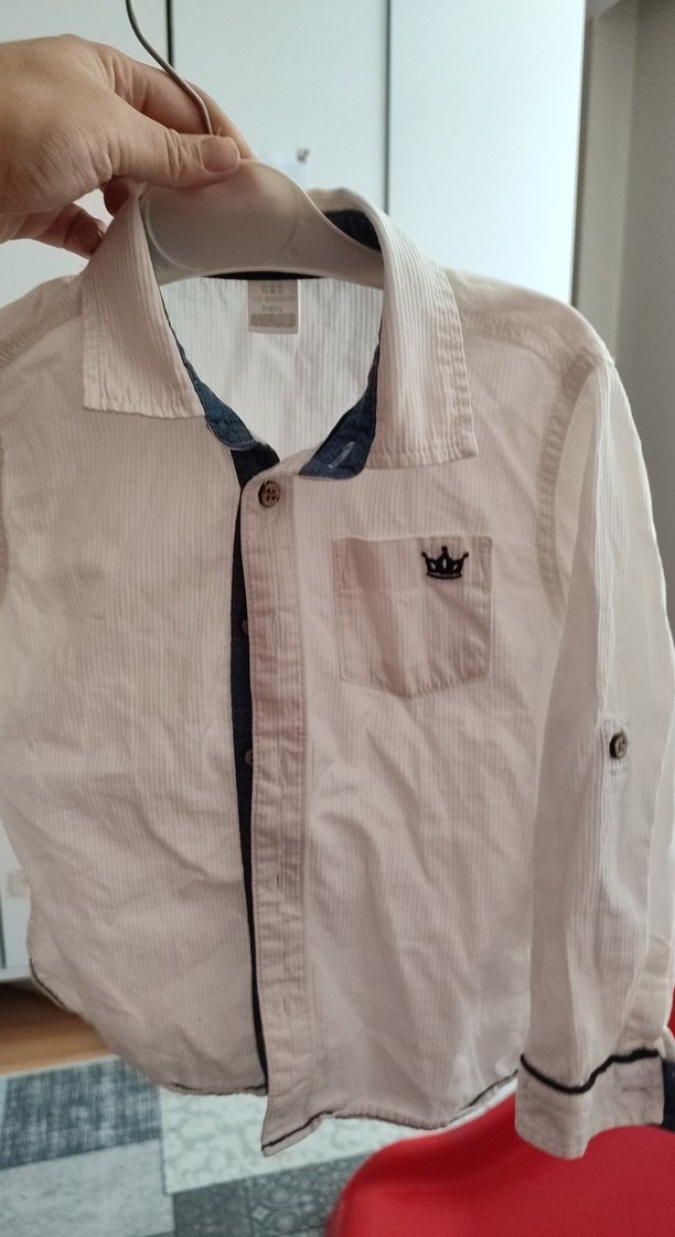 Düğmeli, yakası kesik, uzun kollu beyaz pamuk erkek çocuk gömleği. Regular fit, cepte küçük taç detaylı. kendin çizgili