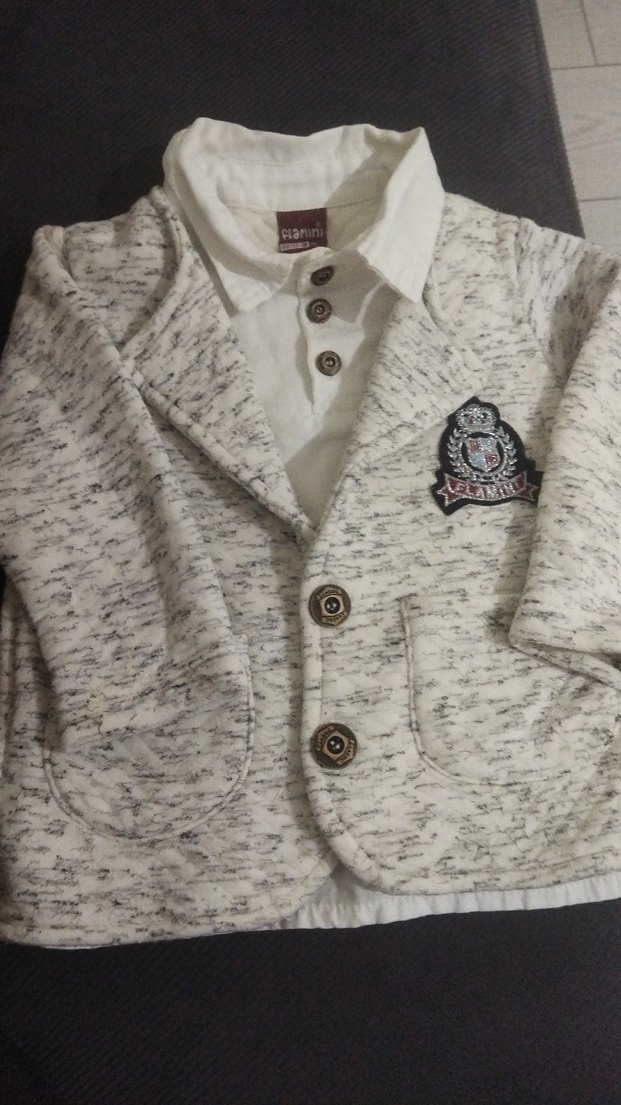 Düğmeli, yakalı erkek çocuk ceketi, yumuşak ve sıcak kumaştan gri desenli tasarıma sahip. Rahat kesimli