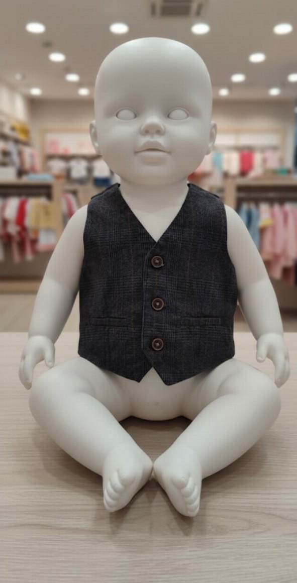 Gri yün kumaştan, düğmeli, yakası kesik erkek çocuk yeleği. Kolsuz ve regular fit, sokak modası tarzında düz desensiz. beden:74