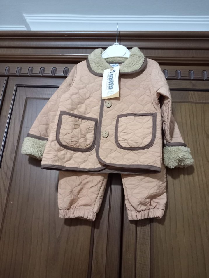 Düğmeli, kahverengi pastel tonlarında, yumuşak ve sıcak kumaştan yapılmış erkek çocuk kabanı. İki ön cepli, klasik kesim, yakada ve kollarda peluş detaylı.