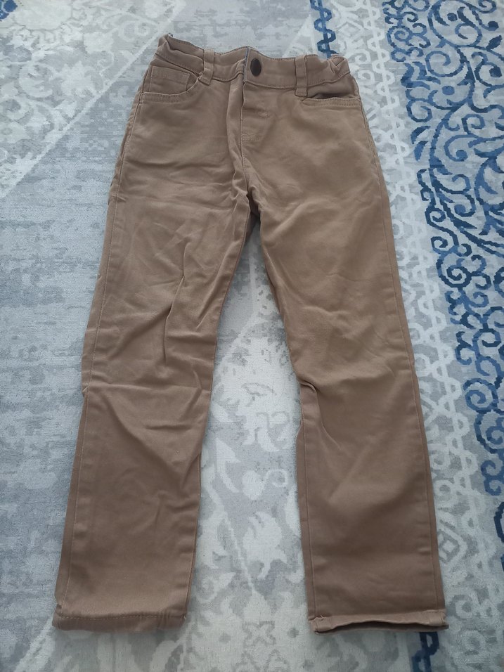 Düğmeli ön kapamalı, düz kahverengi erkek çocuk pantolonu. Sentetik kumaştan, normal kesim ve desensiz, sade stil.