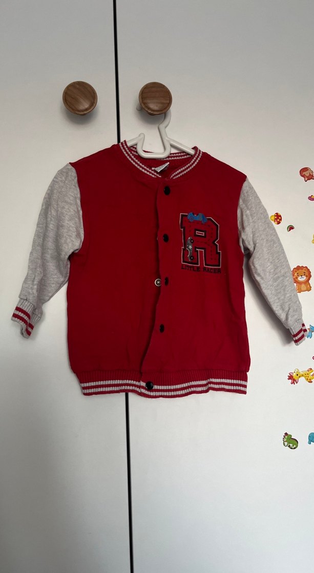 Düğmeli, yuvarlak yaka, renkli nakışlı kırmızı erkek çocuk sweatshirt. Rahat kesim ve yumuşak, sıcak kumaştan üretilmiştir.