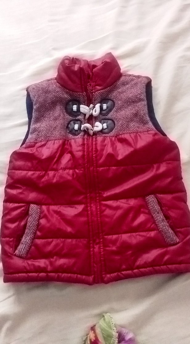Düğmeli, yüksek yakalı, renkli kırmızı tonlarında, yumuşak ve sıcak kumaştan erkek çocuk yeleği. Sokak tarzı, fitted kesim.