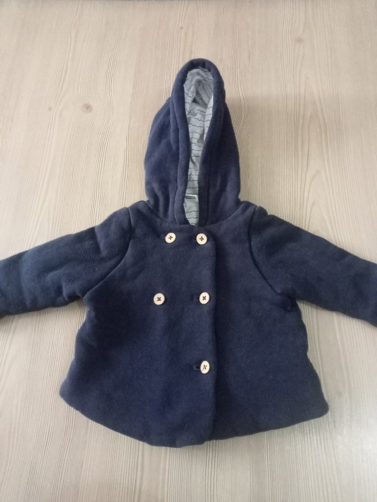 Düğmeli ön kısmı ve kesik yaka detayıyla, yumuşak ve sıcak kumaştan yapılmış, düz lacivert renkli erkek çocuk kabanı.