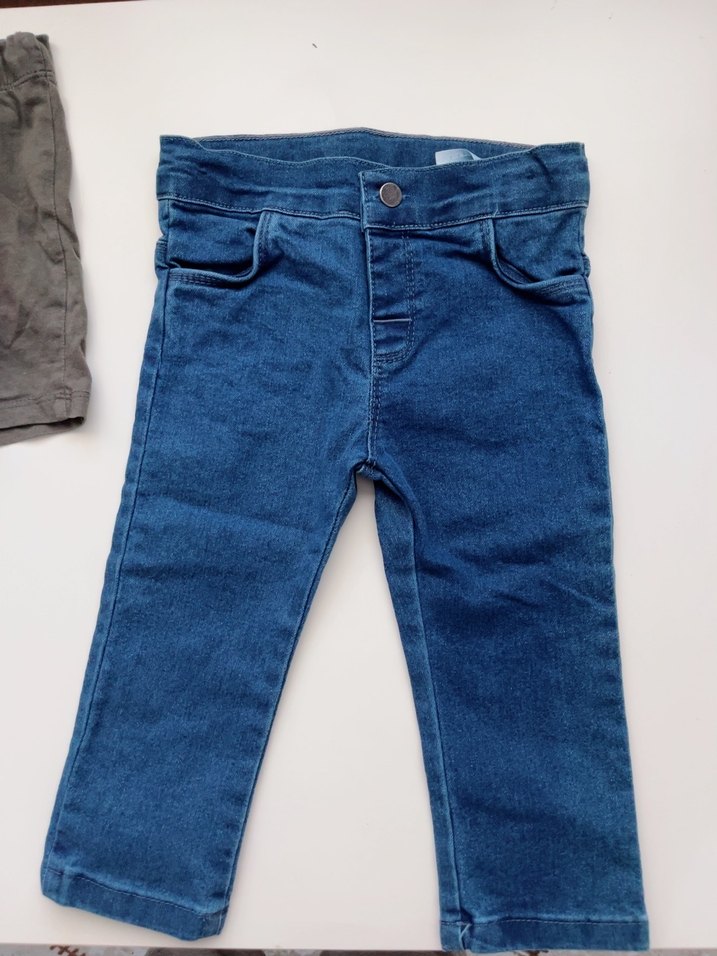 Düğmeli, düz ve desen içermeyen mavi denim kumaştan regular fit erkek çocuk pantolonu.