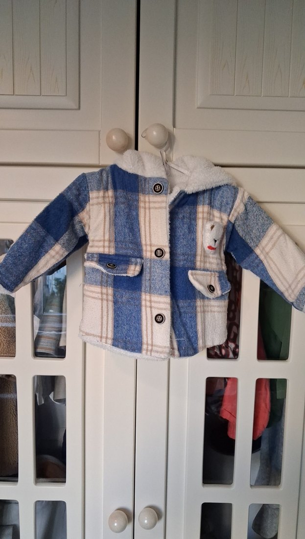 Düğmeli, notched lapel yakalı, bol kesim erkek çocuk ceketi. Yumuşak ve sıcak kumaştan, mavi beyaz ekose desenli, önünde iki cep ve küçük ayı detayı bulunur.