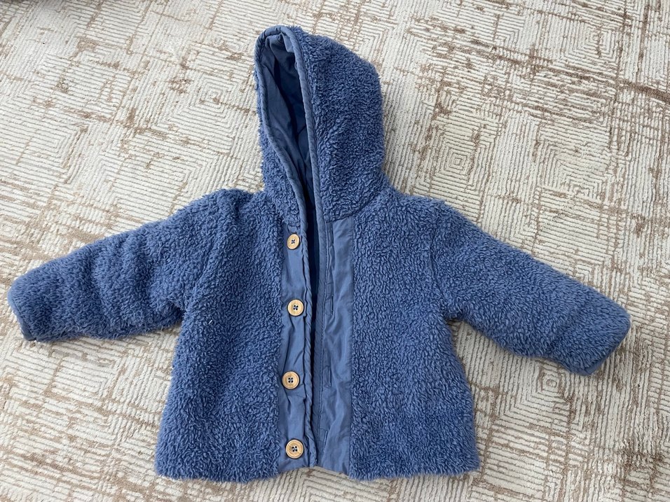 Düğmeli, mavi polar kumaştan yapılmış, temiz ürün