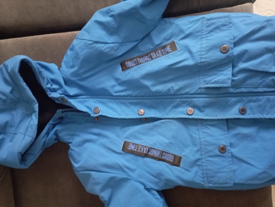 Düğmeli ve baskılı detaylara sahip, mavi renkli, yumuşak ve sıcak kumaştan üretilmiş, kesimi vücuda oturan erkek çocuk ceket.