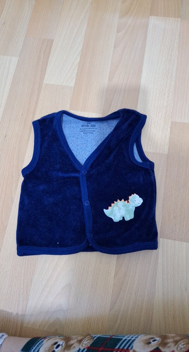 Mavi renkte, düğmeli ve V yakalı erkek çocuk yeleği. Yumuşak, sıcak kumaştan, bol kesim ve renkli dinozor baskılı.
