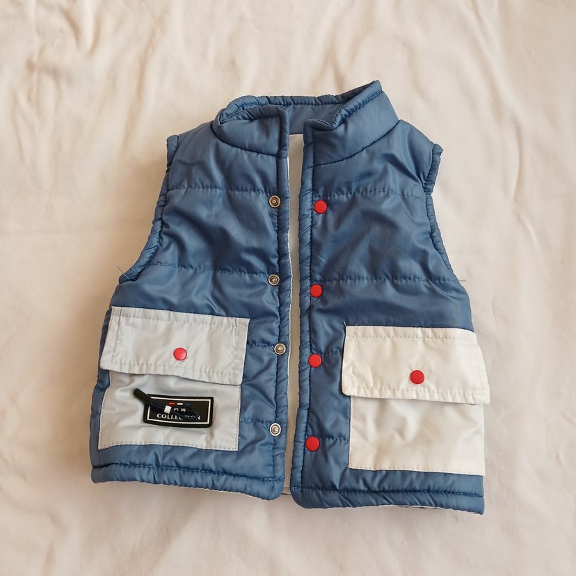 Düğmeli, yakası kesimli, iki cepli, yumuşak ve sıcak kumaştan mavi erkek çocuk yeleği.