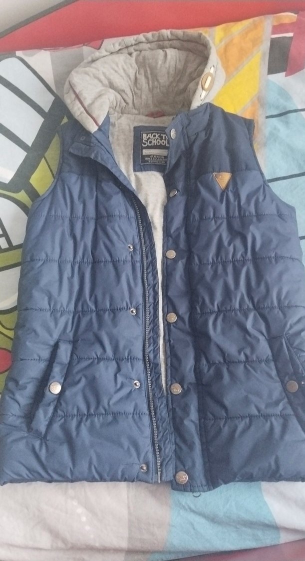 Düğmeli, kolsuz, ince kesim erkek çocuk yeleği. Mavi renkte, gri iç astarlı, rahat ve sıcak kumaştan. Sokak stiline uygun.