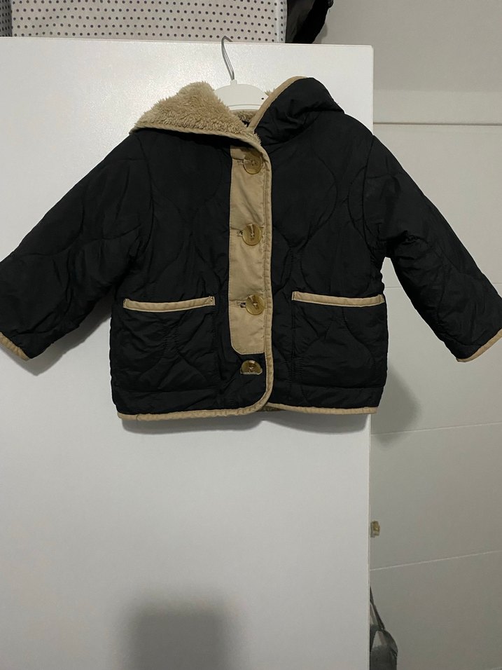 Düğmeli, fit kesim erkek çocuk montu. Siyah ve bej detaylı, yumuşak ve sıcak kumaştan, sade ve sokak tarzı için uygundur. Kapütone kumaş sıcacık