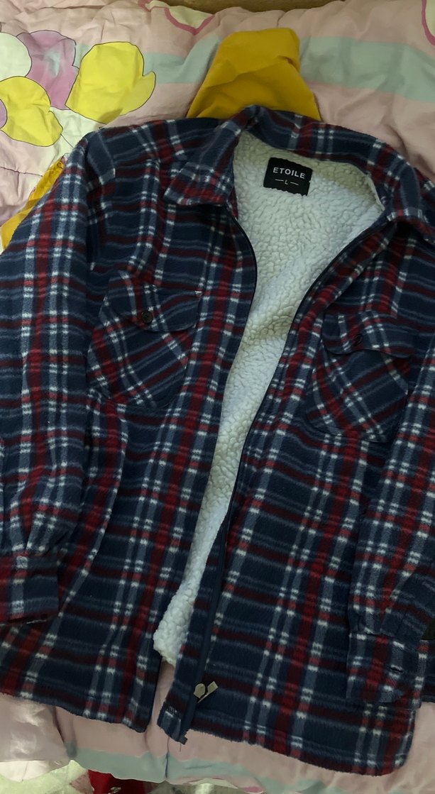 Düğmeli ve yakalı, çok renkli ekoseli erkek polar ceket. Uzun kollu, bol kesim ve yumuşak iç astarlı, günlük rahat kullanım için uygundur.