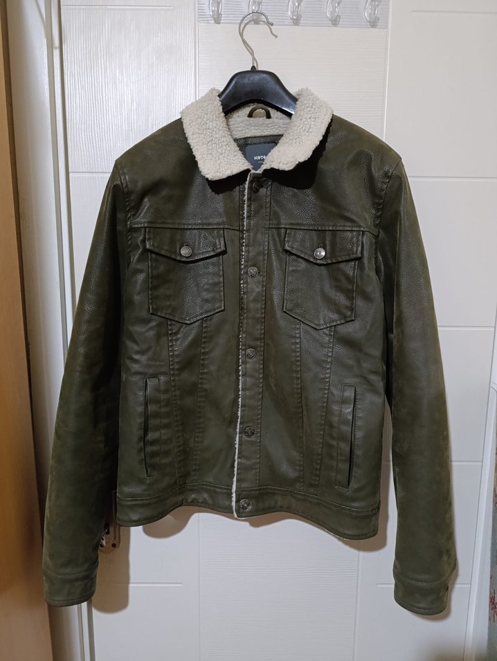 Düğmeli erkek süet ceket, yumuşak astarlı notched lapel yakaya sahip. Uzun kollu, normal midi boyda, koyu yeşil haki tonlarında, sokak stiline uygun. Genişlik 50cm Boy 61cm Kol uzunluğu 67cm