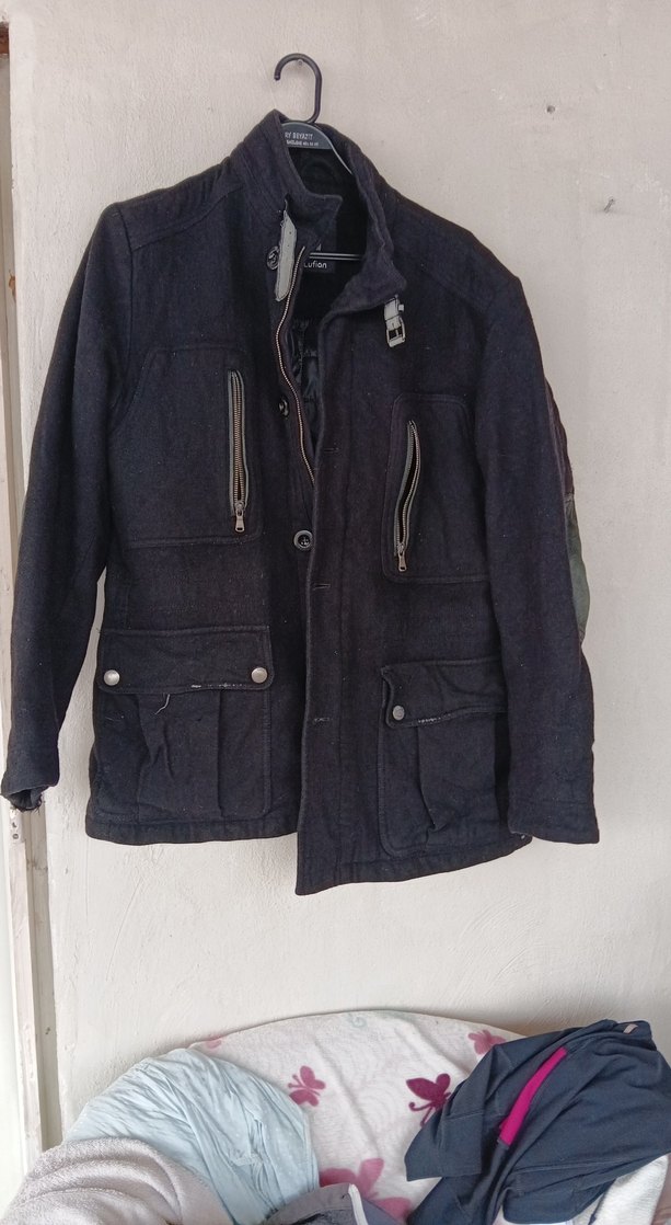 Düğmeli, cepli ve fermuarlı detaylara sahip gri erkek denim ceket, uzun kollu ve normal kesimdir. Sokak stiline uygun rahat bir parçadır. fotoda var görünmeyen iç cep sökük erkek mont