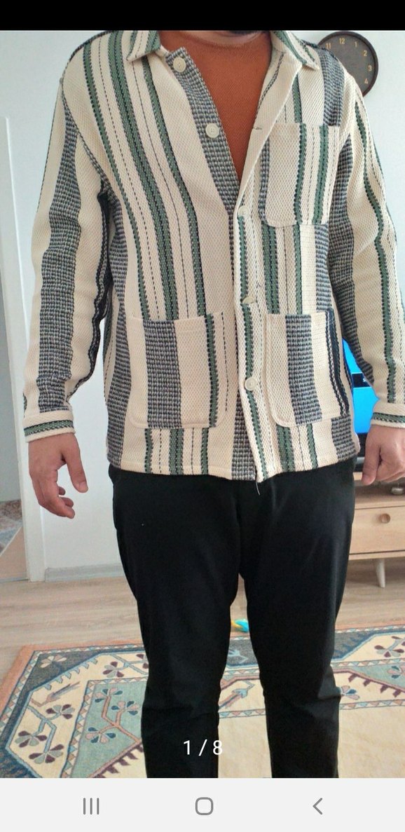 Düğmeli, düğmeli yakalı erkek hırka, uzun kollu ve normal boydadır. Gri tonlu ve tekstil malzemeden üretilmiştir, gündelik kullanım için uygundur.